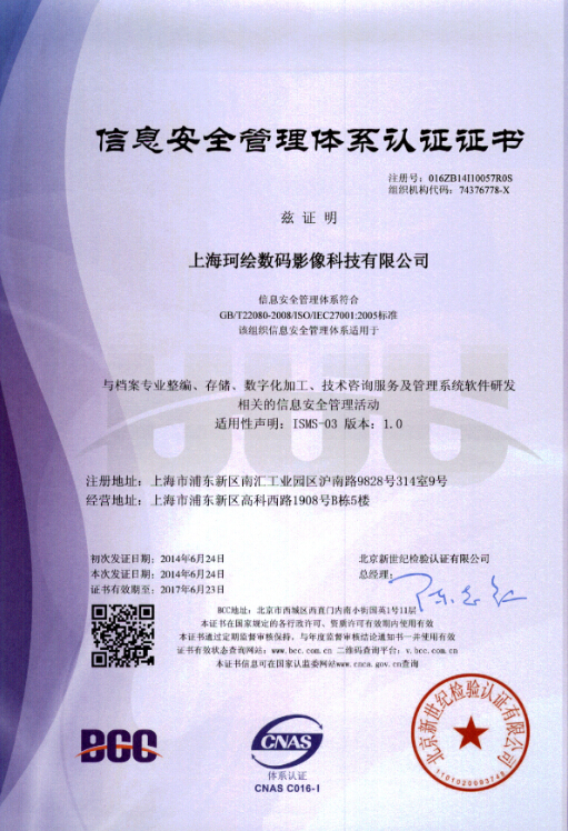 GBT22080-2008ISOIEC20072005信息Ω∑安全管理(lǐ)體(tǐ)系認證證書(shū)