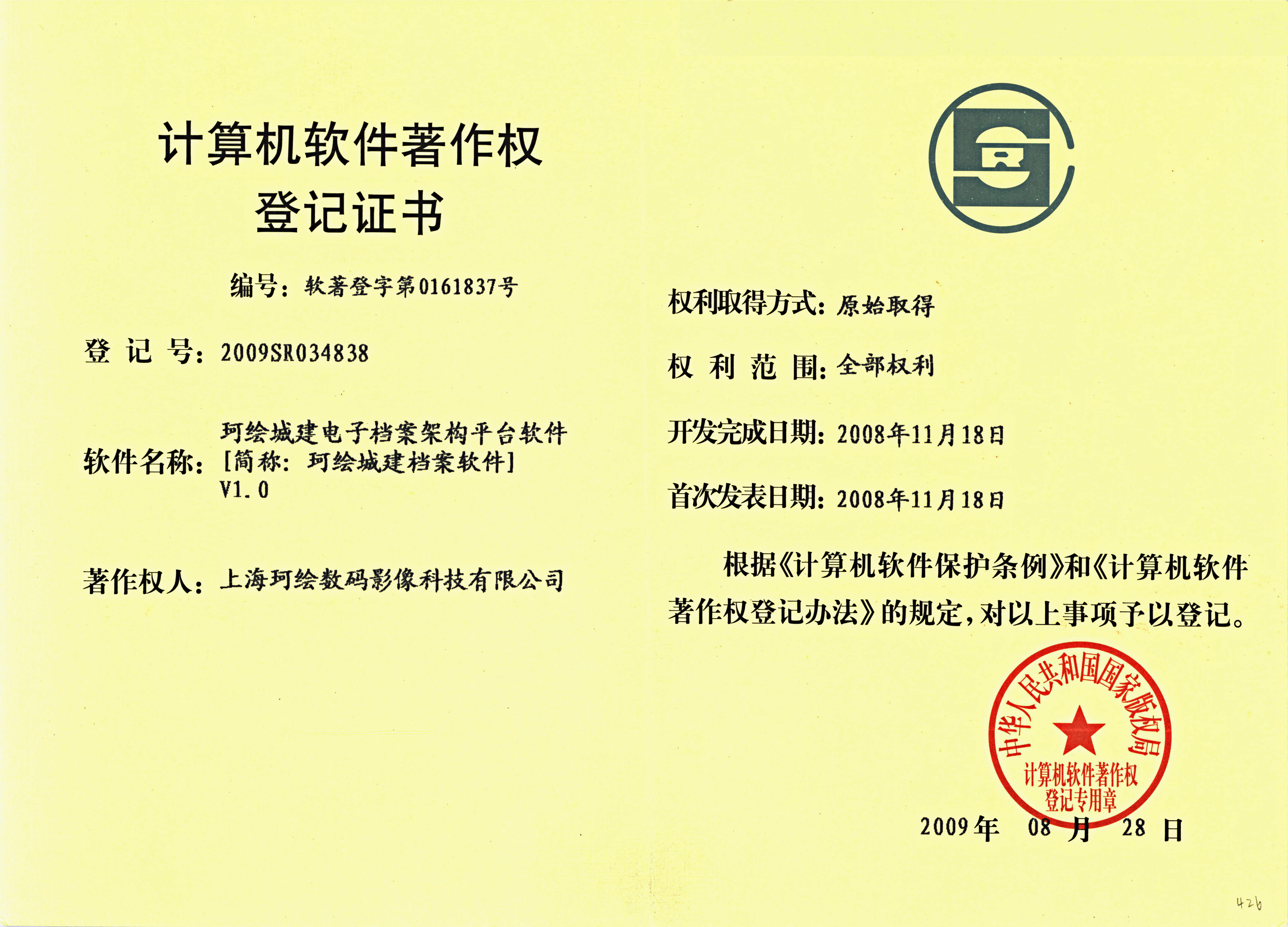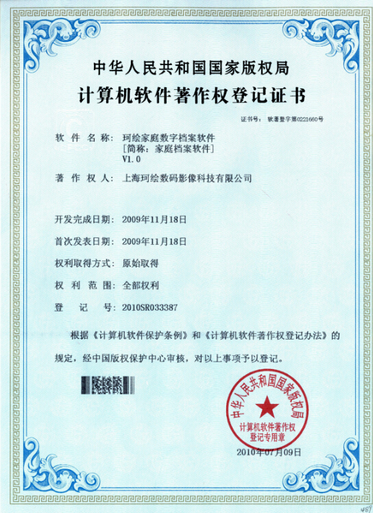 珂繪家(jiā)庭數(shù)字檔案軟件(jiàn)證書(>∏ shū)掃描件(jiàn)